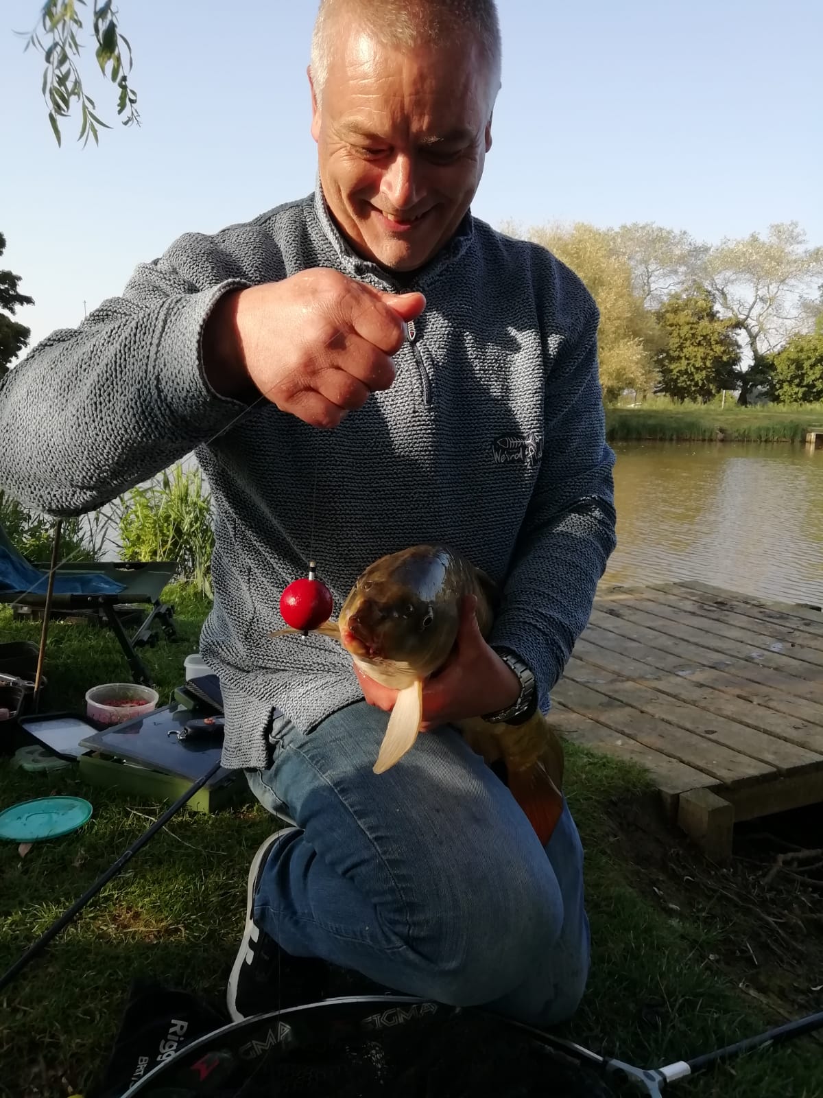The cherry bomb disappeared in front of Ians eyes, Ian felt a heavy tug on the line. The fight was on! After what felt like an eternity of reeling, pulling, and struggling, Ian finally hauled a huge carp to his landing net. It was the biggest fish he’d ever seen—far larger than anything he’d ever caught before.